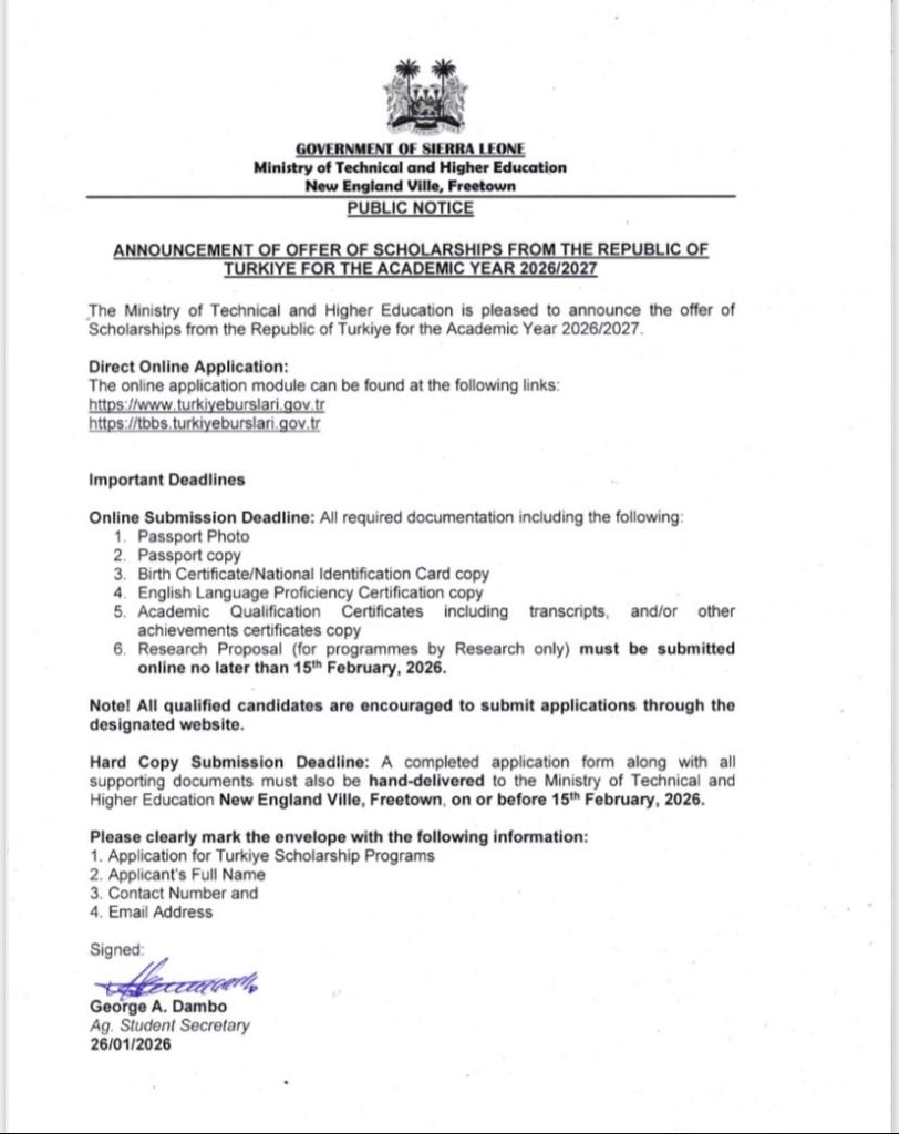 ANNOUNCEMENT OF OFFER OF SCHOLARSHIPS FROM THE REPUBLIC OF TURKIYE